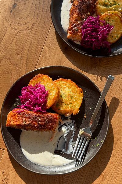 Smokey Salmon with Potato Pancakes & Dilly Sauce